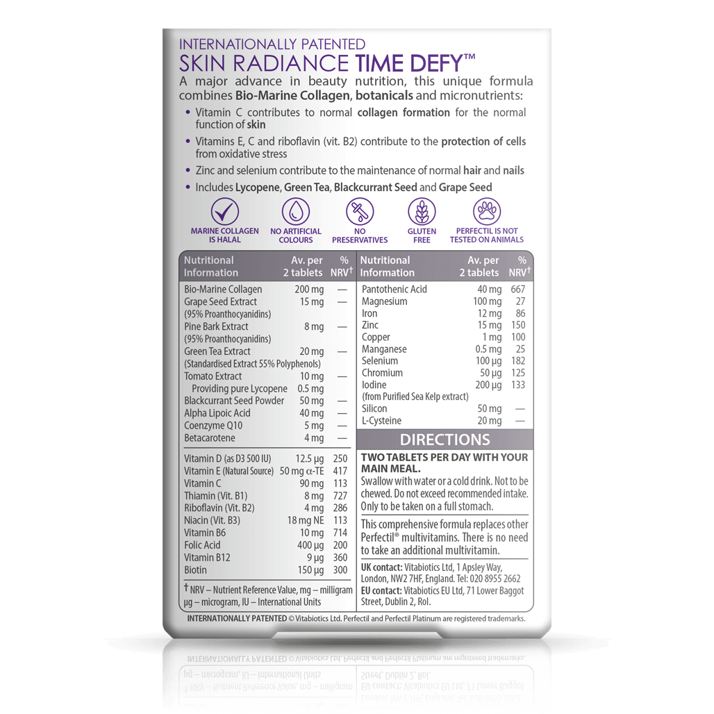 Skin radiance starts from within, so that’s where Perfectil Platinum Radiance gets to work – an advanced cell renewal TimeDefy™ formula with benefits delivered in the bloodstream.